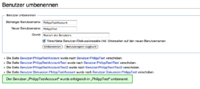 Eine weitere wichtige, aber dennoch selten gebrauchte, Funktion ist das Umbenennen von Benutzern. Dabei werden alle Seiten aus dem Alten Benutzernamensraum in den neuen Benutzernamensraum verschoben (Benutzer:alter Name/Unterseite Benutzer:neuer Name/Unterseite).