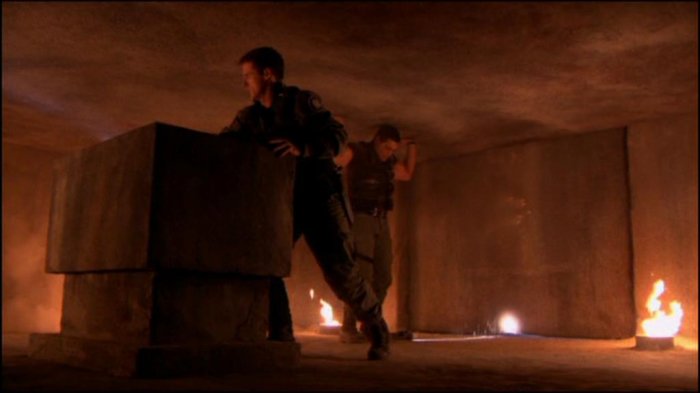 9x01 Mitchell muss ein Rätsel lösen während Teal'c gegen das Herabsinken der Decke kämpft. |