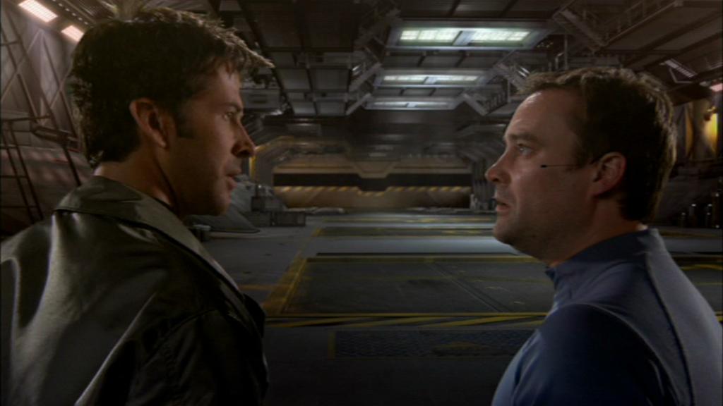 Das Hangartor des Hangars der Daedalus öffnet sich, während McKay und Sheppard im Hangar sind. |