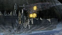 Als das Schiff begann seine Waffen hochzufahren, tauchte Atlantis auf und fing unmittelbar darauf an, auf das Verbesserte Basisschiff zu feuern. Das Basisschiff schoss auf Atlantis und reduzierte die Schilde der Stadt nach der Ersten Salve auf 70%, außerdem wurde die Stadt an den Rand der Erdatmosphäre gedrückt. Durch das Auftauchen der Stadt konnte die Gruppe im inneren noch rechtzeitig zum Gate gelangen. Sheppard aktivierte den Fernzünder, und sobald das Stargate deaktiviert war, explodierte das Verbesserte Basisschiff durch die Detonation des Atomsprengkopfes. [1]