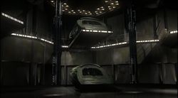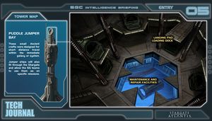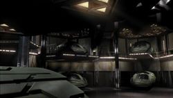 1. Der Haupthangar besitzt Landebuchten für insgesammt etwa 20-30 Jumper. Es besteht aus zwei Stockwerken um Platz zu sparen. Im Boden des Haupthangars befindet sich eine Luke die geöffnet werden kann um mit einem Jumper in den Gateraum zu gelangen. Dieselbe irisartige Luke befindet sich an der Decke des Hangars um auch von hier mit einem Jumper nach draußen zu gelangen.