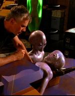 - Die Figuren wurden ursprünglich nur mit Puppen dargestellt, die zum Teil per Hand und zum Teil per Funk gesteuert wurden. Da die Einsatzmöglichkeiten der Puppen allerdings begrenzt waren (Bewegungen im freien Raum sind nicht möglich, weil dies die Figuren zu statisch wirken lässt), wurden ab SG1 5x22 Das Geheimnis der Asgard auch computeranimierte Charaktere verwendet. Im zur Zeit der Produktion der Serie recht aufwendigen und kostenintensiven Motion Capture-Verfahren werden die Bewegungen einer Person aufgenommen und anschließend im Computer auf eine andere Figur übertragen.[44]