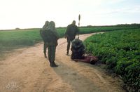 - Als SG-1 die Toten mit Kennzeichnungsmarken versehen soll, bewegt die rechts liegende „Leiche“ kurz ihren Kopf.