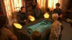 - Ursprünglich sollte das Orakel ein Bildschirm sein, der an der Wand hängt. Doch dies hätte die möglichen Kameraeinstellungen stark eingegrenzt. Schließlich kam Robert C. Cooper mit der Idee auf, es mit einem Tisch zu machen.[6]