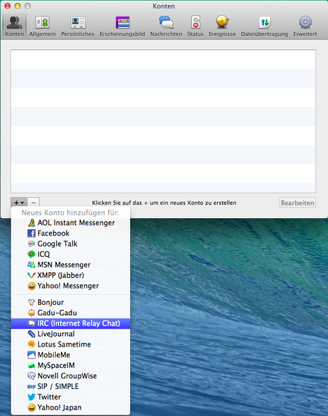 | aktuell | 16:08, 24. Dez. 2013 | 655 × 831 (429 KB) | Felix (Diskussion | Beiträge) | {{Information |Beschreibung = IRC-Chat-Client Adium |Quelle = Screenshot von Benutzer:Felix |Urheber = siehe Lizenz |Datum = |Genehmigung = |Andere Versionen = |Anmerkungen = }} Kategorie:Hilfe [[Kategorie:Wiki- |