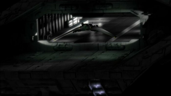 Eine F-302 fliegt aus dem Hangar der U.S.S. Daedalus. |