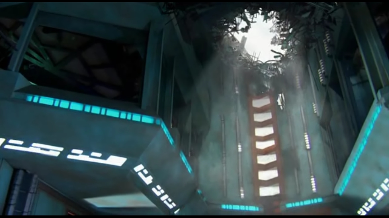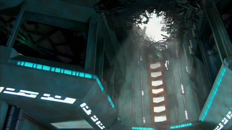 Das kaputte Dach der Atlantis-Kopie, nachdem die Asuraner-Sonde eingeschlagen ist.