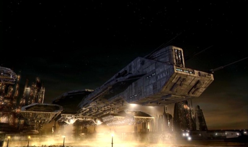 Die USS Daedalus landet an einem der Piers von Atlantis. |