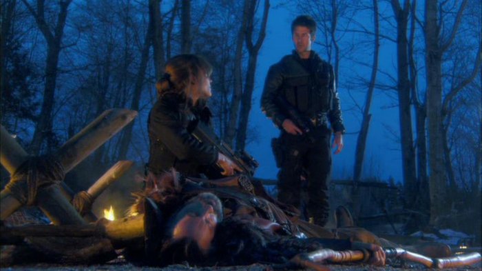 Die Wraith haben das Dorf komplett zerstört, Teyla hat gerade den toten Anführer, Keturah, entdeckt. |
