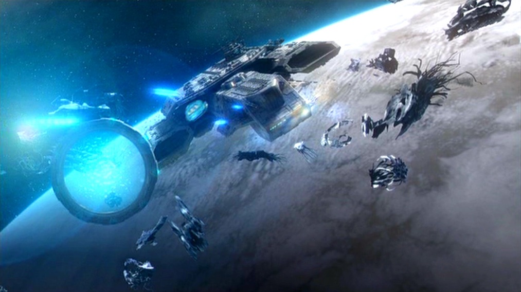 Die Energiekanone auf Doranda feuert auf die Daedalus im Orbit des Planeten.