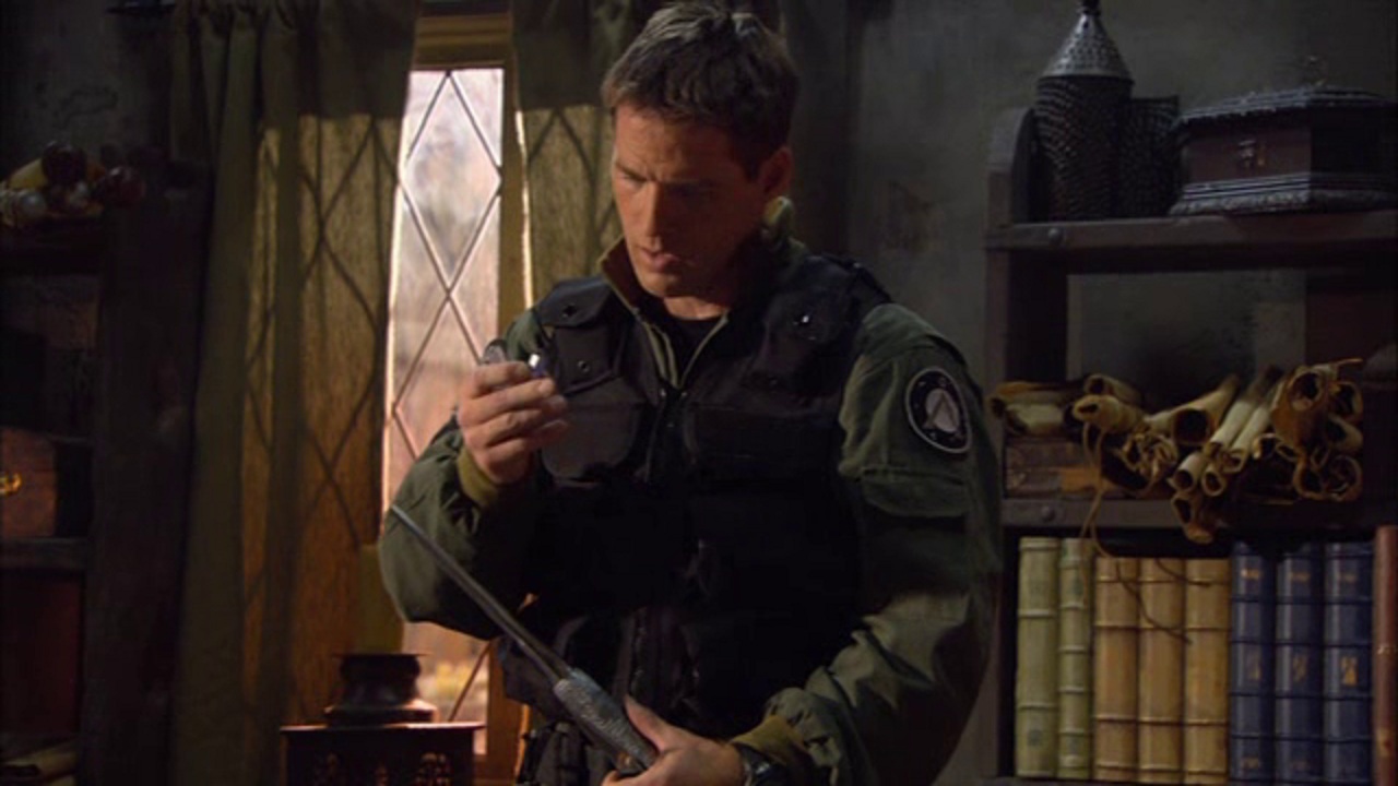Colonel Mitchell mit dem Energiekristal einer Ori-Stabwaffe |