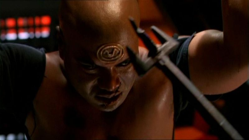 Teal'c wird von Terok mit dem Folterstab bedroht. |