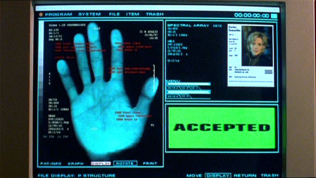 Der Handflächenscanner akzeptiert Samantha Carters Hand. |