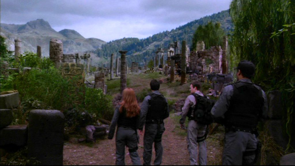 Team Sheppard bei den Ruinen auf M7G-677 |