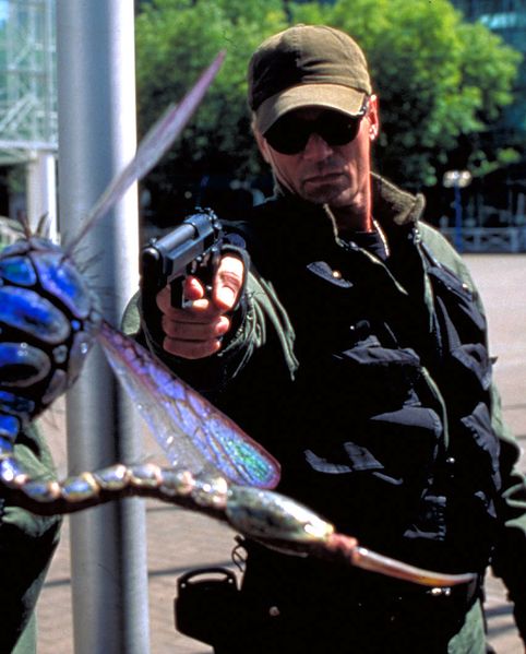 Colonel O'Neill will ein riesiges Insekt, das auf Teal'c sitzt, erschießen. |