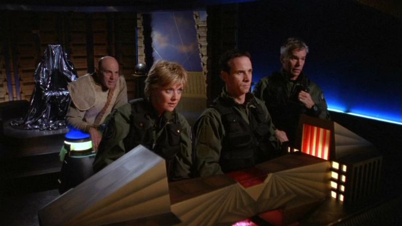 Jacob, Jack O'Neill, Carter und Major Paul Davis stellen fest, dass das Ha'tak abstürzt. |