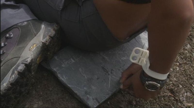 Teyla kratzt Symbole als Hinweise für das Team in den Stein. |