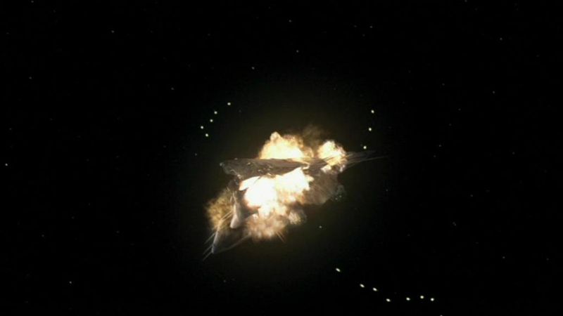 Der Wraith-Kreuzer wird von den Antiker-Drohnen des Antikerschiffes zerstört. |