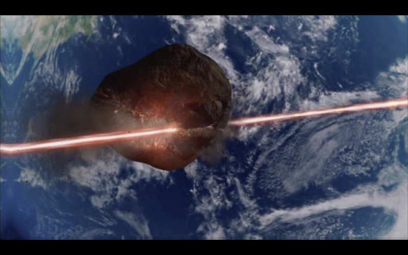 Der Laserstrahl des Stargatesatelliten durchdringt den Asteroiden. |