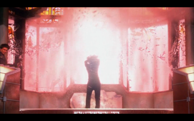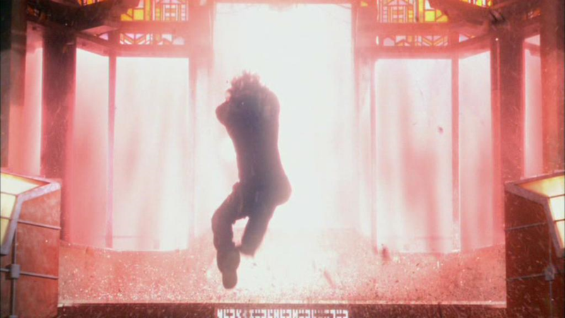 Der Laserstrahl der Asuraner streift den Kontrollturm von Atlantis. |