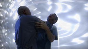 - Beim ersten Angriff (so bei ca. 1:00) sieht man von der Seite die Wand hinter dem Stargate blau leuchten (also wurde das Stargate aktiviert). In der nächsten Szene sieht man das Stargate vom Kontrollraum aus und es schaltet sich nochmal ein. Nachdem das Stargate abgeschaltet wurde, geht der Strahlungstrupp rein. Als der meldet, dass keine Gefahr mehr ist, ist der blaue Schimmer wieder da.
