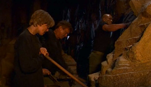 Während der Arbeit bespricht sich SG-1 über die Lage. Carter glaubt nicht, dass es sich um Goa'uld handelt, da der Anführer nicht wie ein Goa'uld spricht und sie bei ihm auch nicht die Anwesenheit eines Goa'uld gespürt hat. Dann kommt ein Jaffakrieger und befiehlt SG-1, Naquadah abzubauen. Als Teal'c, während eines Fluchtversuchs, eine Spitzhacke nach dem Jaffa wirft, stürzt ein Teil der Decke herab und begräbt Daniel unter sich. Jedoch ist es Carter noch möglich festzustellen, dass Daniel noch lebt.