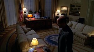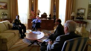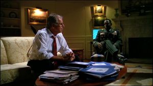 Der Präsident liest sich in die Akten des Stargate-Centers und die Missionsberichte von SG-1 ein und kann nur staunen. Der ebenfalls anwesende Vorsitzende der Joint Chiefs of Staff, General Francis Maynard, bewundert vor allem, wie oft das Team die Erde gerettet hat. Er sieht die Situation etwas anders als Kinsey: Es sei getan worden, was möglich war. Der Feind, die Goa'uld, wäre auf jeden Fall gekommen. Kinsey habe damals[1] die Kontrolle dem NID übertragen wollen, weil er wusste, dass er Vorsitzender des Geheimdienstkontrollausschusses werden würde. Der Präsident ist der Meinung, es müsse noch mehr dahinter stecken. Er habe insbesondere ein schlechtes Gefühl, wo die Wahlkampfgelder herkamen und ob es etwas mit den abtrünnigen NID-Agenten zu tun hätte.