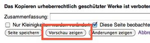 Wenn man einen Artikel bearbeitet oder erstellt, gibt es viele Optionen. Eine davon ist der Button „Vorschau zeigen“: Er ist unter der Copyrightbox und der Zusammenfassungszeile zu finden, zwischen den Buttons „Seite speichern“ (Speichert die Seite sofort) und „Änderungen zeigen“ (Ruft eine Liste auf, in der deine Änderungen gut zu erkennen sind).