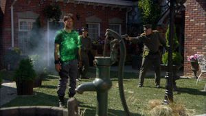 - In der Szene, in der Lucius seine Unverwundbarkeit beweist, indem er eine Palette mit schweren Dingen auf sich fallen lässt, ebenso in der Szene, in der er von den Männern mit den Brettern angegriffen wird, setzte man einfach einen extra dafür gebauten grünen Eisenmann an Richard Kinds Stelle, sodass man nur noch ein Bild von ihm darauf abbilden musste. Die Bretter, mit denen die Männer auf ihn einschlugen, zerbrachen also wirklich an dem grünen Eisenmann.[1]
