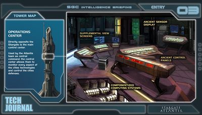 Im Kontrollraum trifft man auf dasselbe sechseckige DHD mit dreieckigen Tasten wie in den Jumpern. Das Spezielle am Stargate in Atlantis ist, dass es das einzige ist, mit dem man die Erde anwählen kann [3], weshalb es so wichtig ist, dass Atlantis nicht in die Hände der Wraith fällt. Atlantis besitzt wie das Stargate-Center einen Anwahlcomputer, wenn auch ohne die Nachteile des Erd-Stargates, so wird das Wurmloch zum Beispiel sofort aufgebaut, nachdem man die Adresse eingegeben hat. Viel wichtiger ist aber, dass man nicht jedes Mal, wenn man das Stargate durchschreitet, in das Risiko läuft, durch eine Fehlfunktion des Computers am falschen Ort, zur falschen Zeit oder gar nicht herauszukommen.