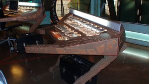 Die Konsolen sind in vier Gruppen angeordnet. Zwei davon stehen leicht erhöht in der Mitte des Raums, leicht angewinkelt nach vorne ausgerichtet vor dem Bildschirm. Ebenfalls angewinkelt stehen weiter unten weitere drei Konsolen, auf einer davon das DHD. Zu guter Letzt findet sich noch eine einsame Konsole neben der Brücke, die zum Büro führt, und eine neben der Türe zum Balkon.[2]