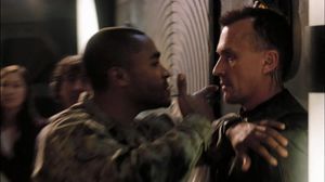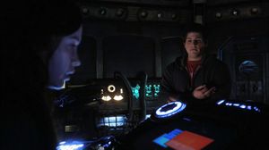Brody (zu Park): Ich wette um 'ne Tagesration, dass er [Rush] nicht antwortet. (Ins Funkgerät) Dr. Rush, hier ist Brody, bitte melden. (Keine Antwort) Dr. Rush, bitte antworten Sie! (Immer noch nichts, er dreht sich zu Park um.) Sie schulden mir was.
