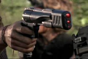 - Die verwendete Waffe ist vermutlich eine Replica eines Colt Navy von 1851. Dies ist eine bei Sportschützen beliebte Vorderladerwaffe und in den USA leicht erhältlich. Für die Aufnahmen wurden diverse Modifikationen vorgenommen: Der Hahn wurde entfernt, ein Mündungsaufsatz wurde befestigt (Vermutlich Zubehörkompensator für eine Colt 1911 Pistole), dort eingelassen wurden Leuchtdioden an der Mündung. Der Griff wurde mit Tuch umwickelt. Die Verkleidung des Laufes von der Trommel zur Mündung scheint eine Eigenfertigung aus einem gebogenen, brünnierten Blechstück zu sein, in der auch die Batterien, Schalter und Leuchtdioden für die Schussstärkeeinstellung untergebracht sind.