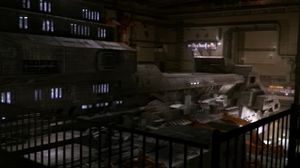 Die Prometheus verfügt über ausreichend Hangarraum für eine Staffel F-302er, bestehend aus acht Stück[13]. Der Hangar befindet sich im zentralen Rumpf des Schiffes mit einem vorderen[1] und einem hinteren[8] Eingang. Damit die F-302 in den Hangar gelangen können, existiert eine kurze Landebahn auf der Oberseite der Prometheus.[1]