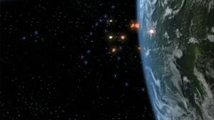 Zwei Basisschiffe zerstören sich durch eine Provokation von John Sheppard im Orbit von Edowin gegenseitig.