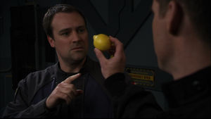 • Er ist der Einzige, der bei der Geburt von Teylas Sohn dabei ist, und muss auch gleichzeitig die Hebamme mitten auf Michaels Wraith-Kreuzer spielen.[56]