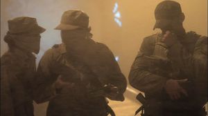 Die sind nun auf einem anderen Planeten, sie stehen in einem nebligen Wald und diskutieren, wie lange sie dort bleiben sollen. Doch ein bedrohliches Brüllen veranlasst sie zum sofortigen Gehen. Eli wählt eine andere Adresse an und gerade als die drei gehen wollen, stampft ein riesiges dinosaurierähnliches Lebewesen aus dem Wald auf sie zu. Scott, der als letzter geht, schießt noch auf das Angreifer, doch da das nicht viel anrichtet, geht auch er.